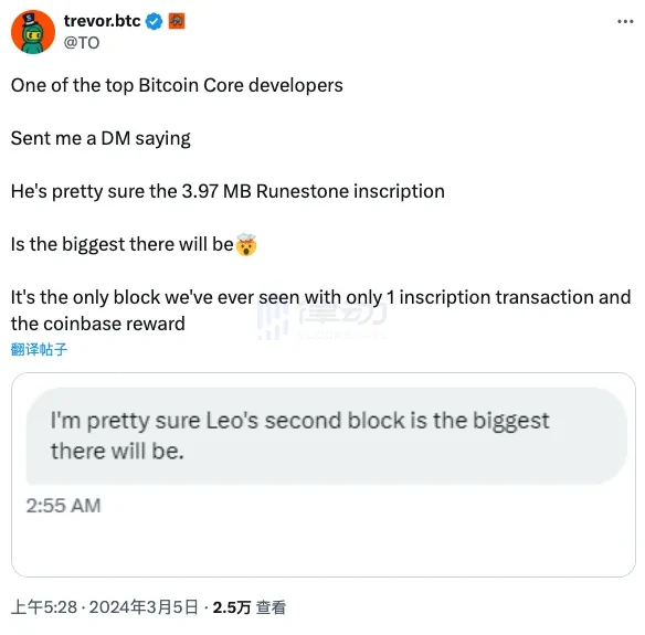 之后,TO 也在社交媒体上印证了这一点,他表示一位 TOP 级别的 Bitcoin Core 开发者,给他发了一条 DM,他非常确定 3.97 MB 的符石铭文是目前最大的区块。