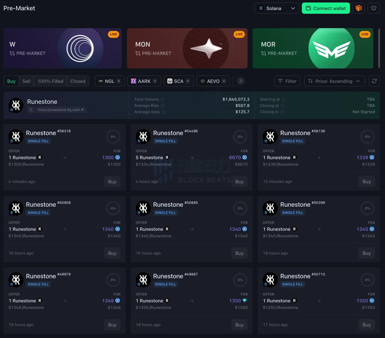 截止撰稿时间,据 Whales Market 数据显示,符文项目 Runestone OTC 最高成交价已达 1300 美元区间。