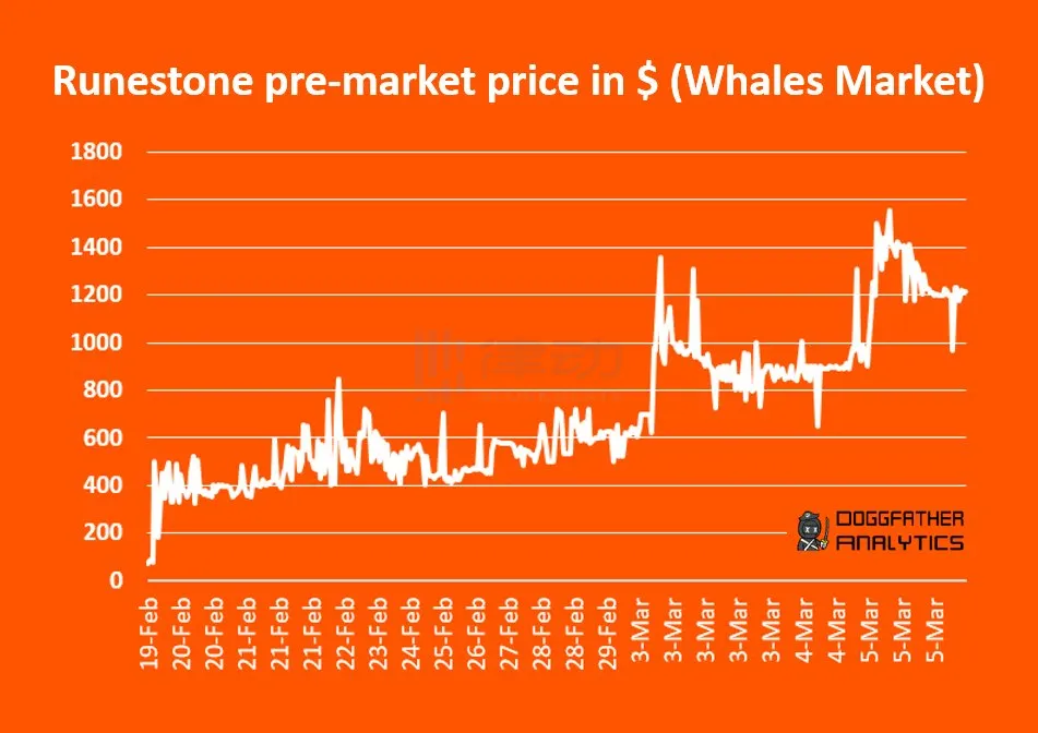 据 Doggfather 整理的 Runestone 价格趋势线,可以看出 Runestone OTC 的最高价格曾在 3 月 5 日逼近 1600 美元,刷新 Runestone 估值最高记录。