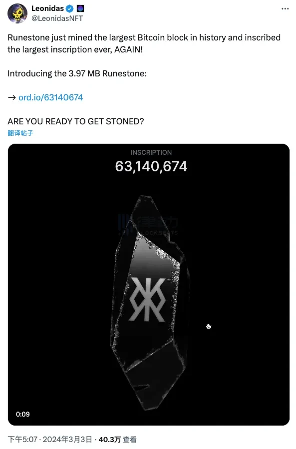 3 月 3 日,Leonidas 在社交平台发文表示,今天早些时候,Runestone 挖出了比特币历史上最大的区块,刷新了 Taproot Wizards 达到的 3.96 MB 的记录,达到 3.97 MB 的区块大小。
