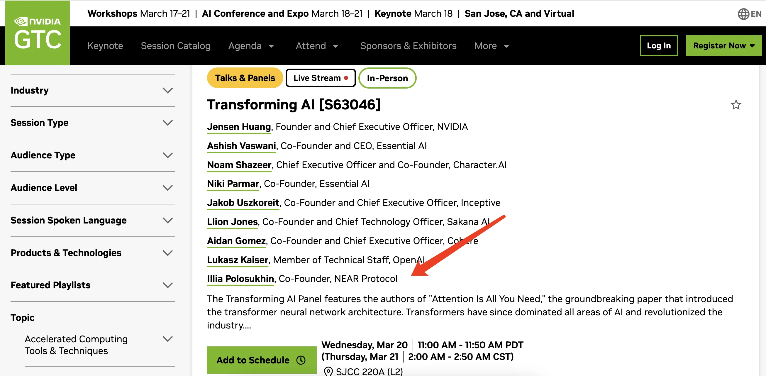 昨晚英伟 达 G TC2 4 大 会议程公布是 AI 板块上涨的直接原因 ,多个宣布参与 GTC24 大会的 AI 项目引领板块上涨,其中,最引人注目的非 NEAR Protocol 莫属。根据 nvidia.com 公布的 大会议程信息,NEAR Protocol 联合创始人 Illia Polosukhin 将出席英伟达 GTC24 大会,与黄仁勋等人进行讲座及小组讨论活动。