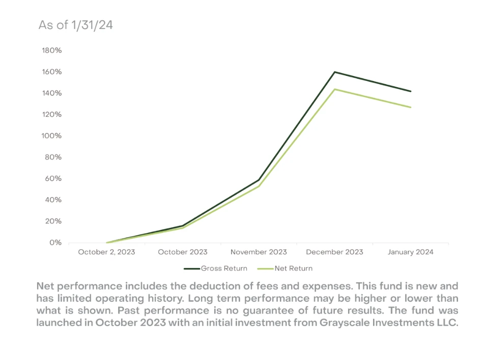 从下图可以看出,该基金在 2023 年 10 月已经启动。灰度早期用内部资金为该基金提供了启动资金,该基金目前最高毛利率约为 160% ,在扣除相应费用后,净利率为 140% 。