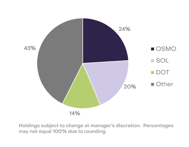 灰度 GDIF 投资组合目前包含了 9 种加密资产: Aptos(APT)、Celestia(TIA)、Coinbase Staked Ethereum(CBETH)、Cosmos(ATOM)、Near(NEAR)、Osmosis(OSMO)、Polkadot(DOT)、Sei Network(SEI)和 Solana(SOL) 。下图为目前 GDIF 基金的资产占比,其中排在前列的是 OSMO 占比 24% 、SOL 占比 20% 、DOT 占比 14% 以及剩余部分占比 43% 。