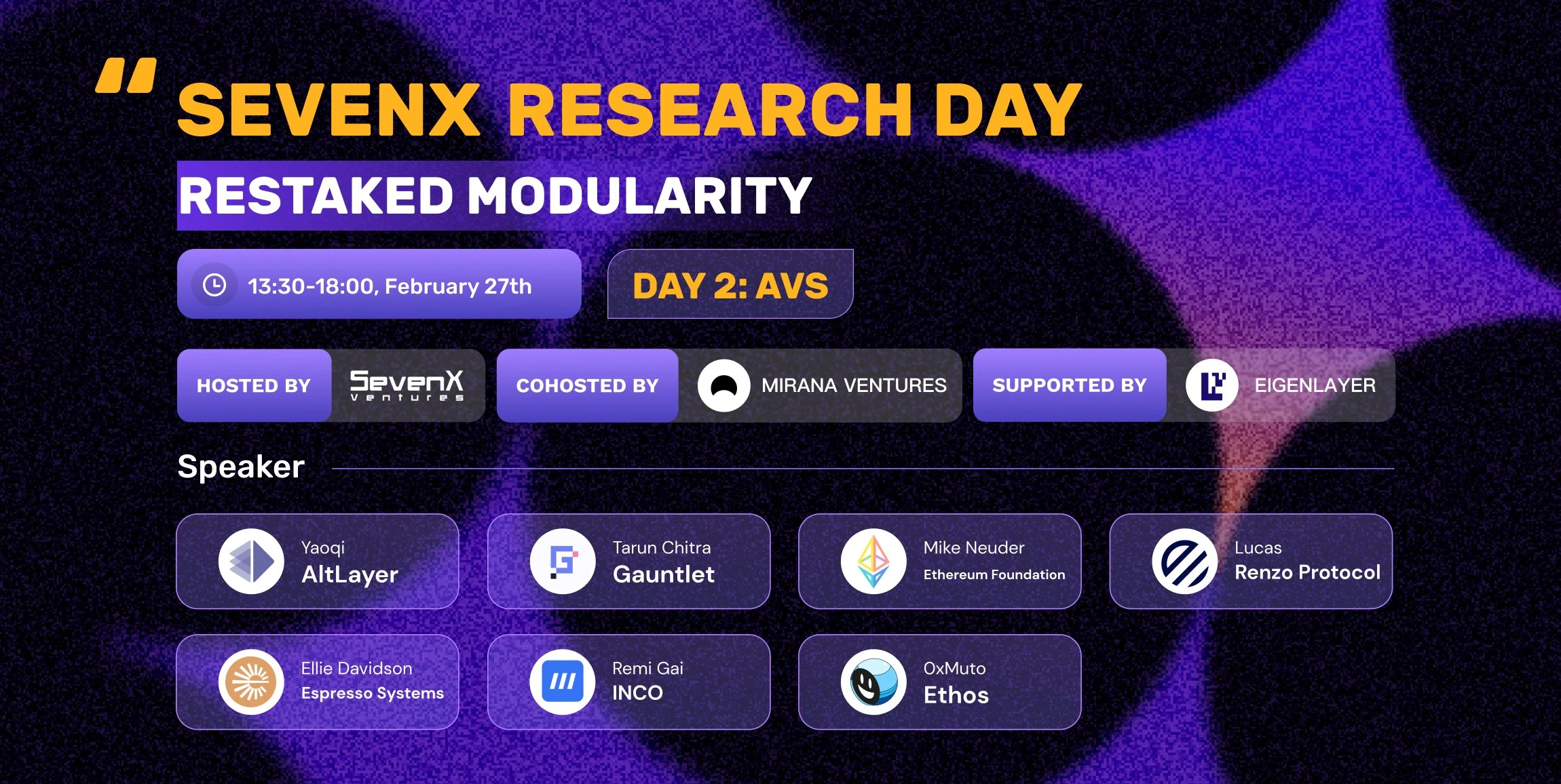 作为从早期就关注并且持续追踪和研究 Restaking(再质押)和 Modularity(模块化)叙事的基金,SevenX 在 EigenLayer 的支持下,于 ETH Denver 2024 期间与 Mirana Ventures 一起举办了为期两天的 Research Day,邀请到了 Restaking(再质押)和 Modularity(模块化)领域的头部研究员和一线项目创始人以及核心成员共同讨论相关前沿话题。