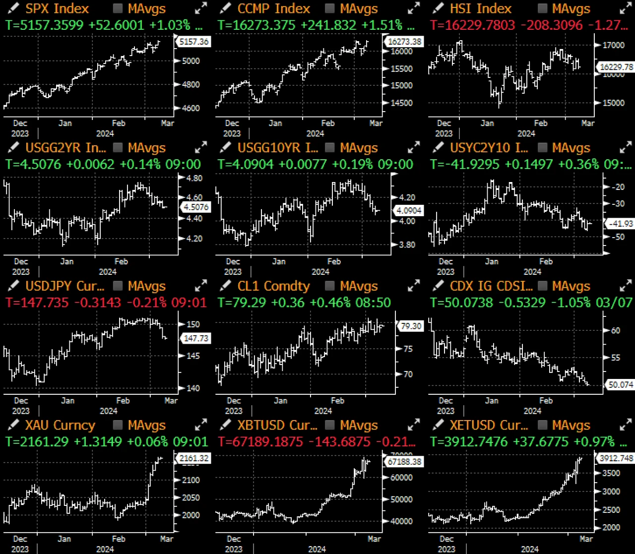 股市方面,得益于欧洲央行和芯片设备制造商 ASML 股价的推动,欧洲 Stoxx 600 指数创下历史新高。美国方面,Nasdaq 指数和 SPX 指数也各自上涨了 1.5% 和 1% ,将于本月 18 至 21 日举行的 Nvidia GTC 大会可能是影响 AI 和科技股的下一个事件,不过这家芯片巨头在市值上赶上 Apple 似乎只是时间问题。
