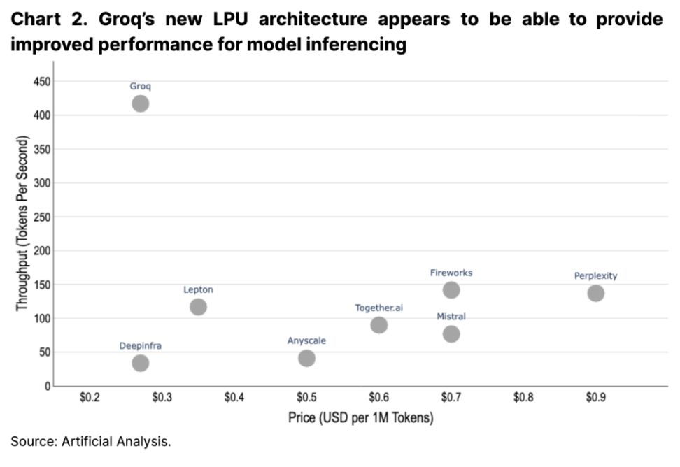 我们看到的第二个主要趋势是围绕硬体架构的竞争格局。 NVIDIA (Nvidia) 的 H200 处理器将于 2024 年第二季度上市,下一代 B100 的效能预计将进一步翻倍。此外,Google 对其自有的张量处理单元 (TPUs) 的持续支援以及 Groq 的新语言处理单元 (LPUs) 可能在未来几年中也会增强他们在此领域的市场份额(参见图 2)。