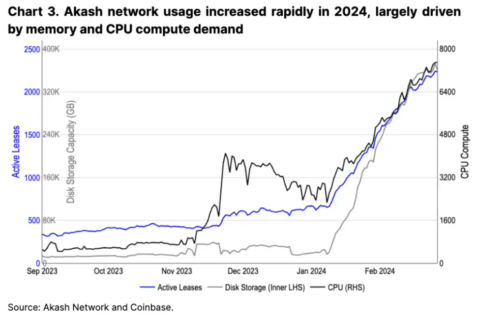 据初步指标显示,此类专案似乎在使用者和供应商的采用率上均获得了增长。例如,Akash 从今年年初至今的活跃租赁(即使用者数量)增加了三倍(见图 3),这主要是由于其储存和计算资源的使用量增加。