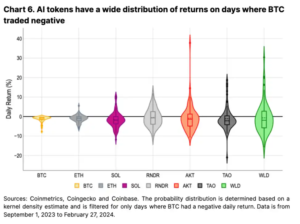 因此,即使比特币价格下跌,以人工智慧为重点的代币也会经历价格上涨波动,从而在比特币下跌期间产生上涨的波动性。图 5 展示了比特币交易下跌的日子裡 AI 代币的表现。
