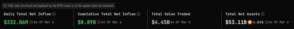 据 SoSoValue 数据显示,截至 3 月 7 日,比特币现货 ETF 的总资产净值已经达到了 531.1 亿美元,净资产比率(净资产价值 / 比特币总市值)达到了 4.04%,历史累计净流入达到了 88.9 亿美元。