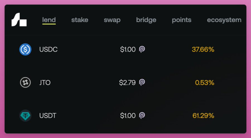 积分与空投预期也导致了稳定币的高收益率,Degen 空投猎人正在借入稳定币以赚取更多积分。在 Solana 生态协议 Marginfi,可以发现 USDT 借贷利率已经达到 61% ,难以想象。