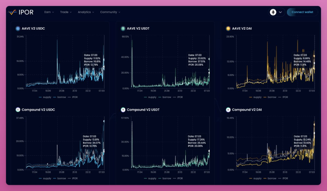 据 IPOR 指数显示,Aave V2 上的 USDT 借贷利率在短短一年内从 1% -2% 飙升至 37% 左右。这表明,链上交易者整体看涨,不断地借入稳定币来购买其他币种,或者参与链上收益活动。