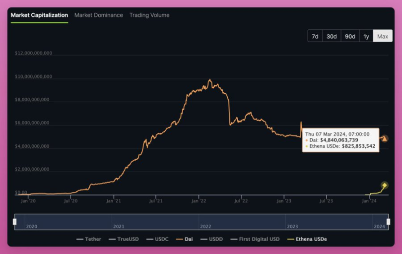 项目方在稳定币收益方面竞争非常激烈。此前在熊市看起来很诱人的 Maker RWA 收益,跟如今牛市中的投机性收益相比,就逊色了许多。sDAI 收益率为 5% ,而 Ethena labs 的 USDe 收益率为 33% (sUSDe 年化率 67.2% ,还有空投预期)。因此,与 Ethena 相比,DAI 供应量的增长自然就会慢些。
