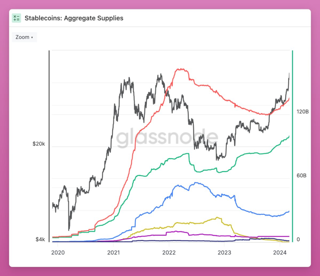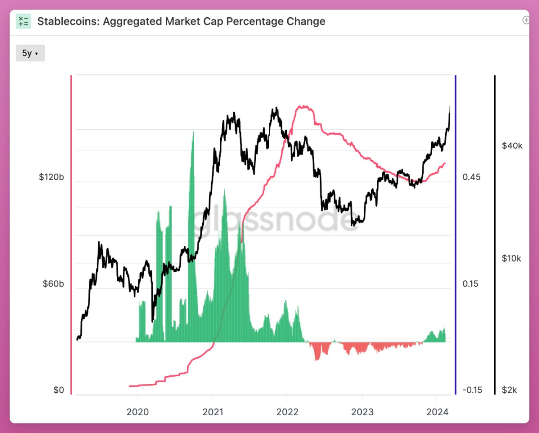 稳定币供应量的扩大与资本流入量增加有关,但现在整个市场行情还处于早期,去年 10 月才开始由降转增。