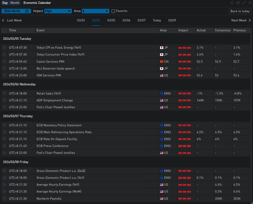数字货币方面,BTC 小幅震荡上行至 67000 美元,整体波动率水平走陡下行;ETH 价格上行逼近 4000 美元,IV 曲线走陡,远端波动率明显升高,同时期权成交量相对 BTC 的比例升高,观察到 15 MAR 大量看涨期权买入,表达了短期内突破 4000 美元关口的信心以及突破后上行空间的展望;另外在今日交割前 19000 张 8 MAR 的 3000 P 被 Roll 到 29 MAR 3600 P,持续为多头提供保护,还有四月底 26 APR 单笔 12500 ETH 的 3600 vs 4600 看涨 Long Call Spread,共同组成了过去 24 小时 ETH OI 最显著的增长位置。