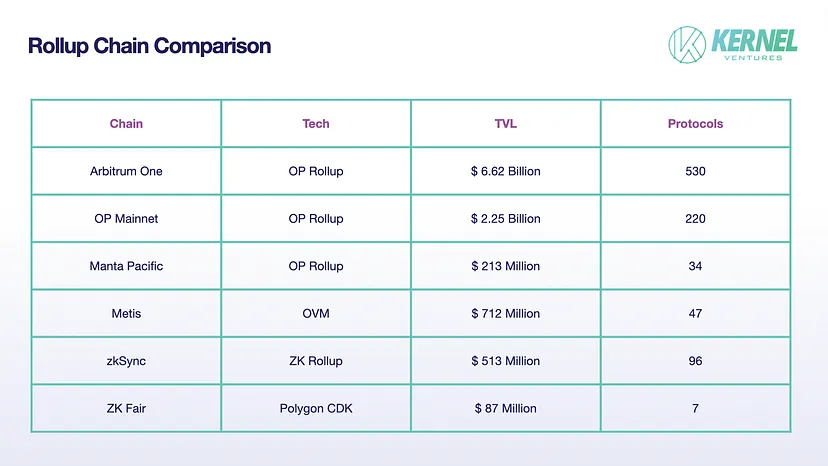 从数据中可以明显看出,目前 OP 和 ARB 在 Rollup 链中仍占据主导地位。然而 Manta 和 ZkFair 这样新加入者已经在短时间内积累了相当大的总锁定价值(TVL)。尽管如此,就协议数量而言,他们可能还需要一些时间才能赶上 OP 和 ARB。主流 Rollups 的协议已经发展成熟,其基础设施也很完善。同时,新兴 区块链 在协议扩展和基础设施增强方面仍有发展空间。