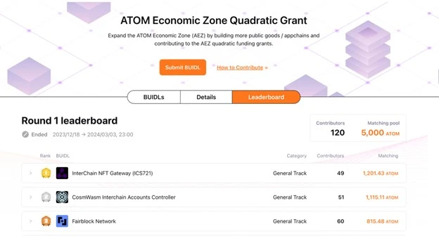 作为 Cosmos 生态的首次长期二次方资助项目,AEZ QF 长期开放 grant 申请及社区捐助通道,并定期提供二次方资金池,为入选项目提供额外资助。查看首轮资助结果或提交项目申请,请见: https://dorahacks.io/aez/leaderboard [ 1 ] [ 2 ]