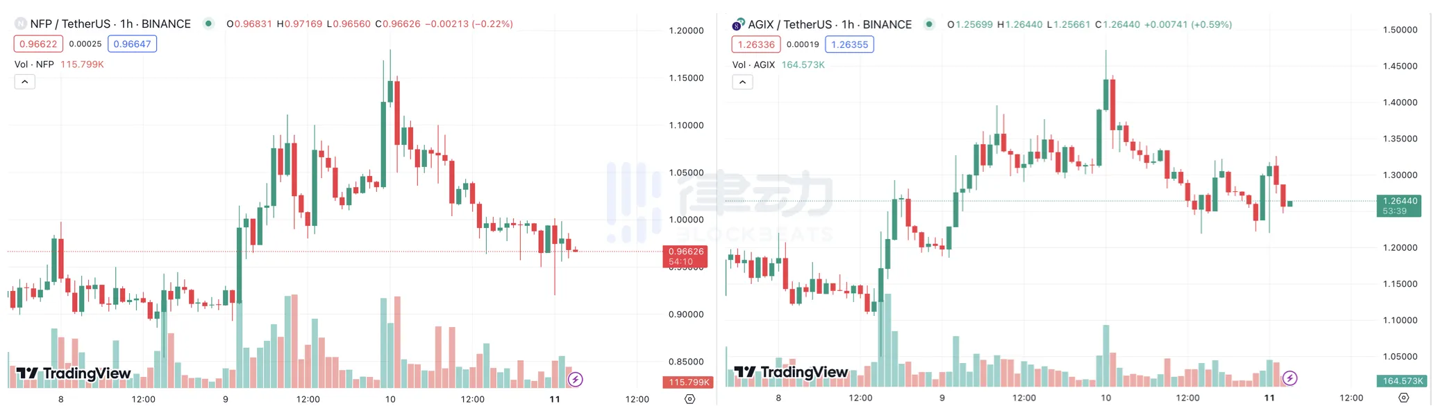 AI 驱动的 UGC 平台 NFPrompt(NFP) 24 小时跌超 15% 并仍在下跌,去中心化 AI 市场 SingularityNET(AGIX)也较高点跌去了超 10% 。