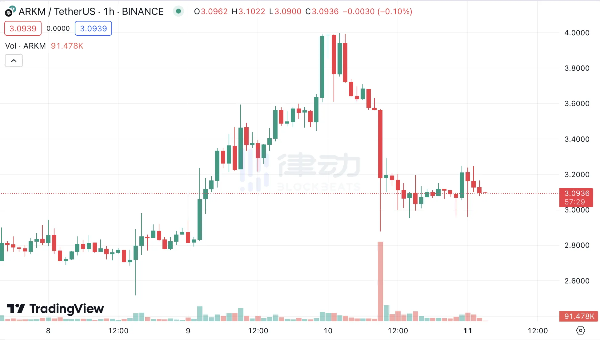 AI 驱动的数据分析平台 Arkham(ARKM)跌破 3 美元,在昨日 5 分钟内跌幅达 17.5% ,现报价 3.1 美元, 24 小时跌超 20% 。