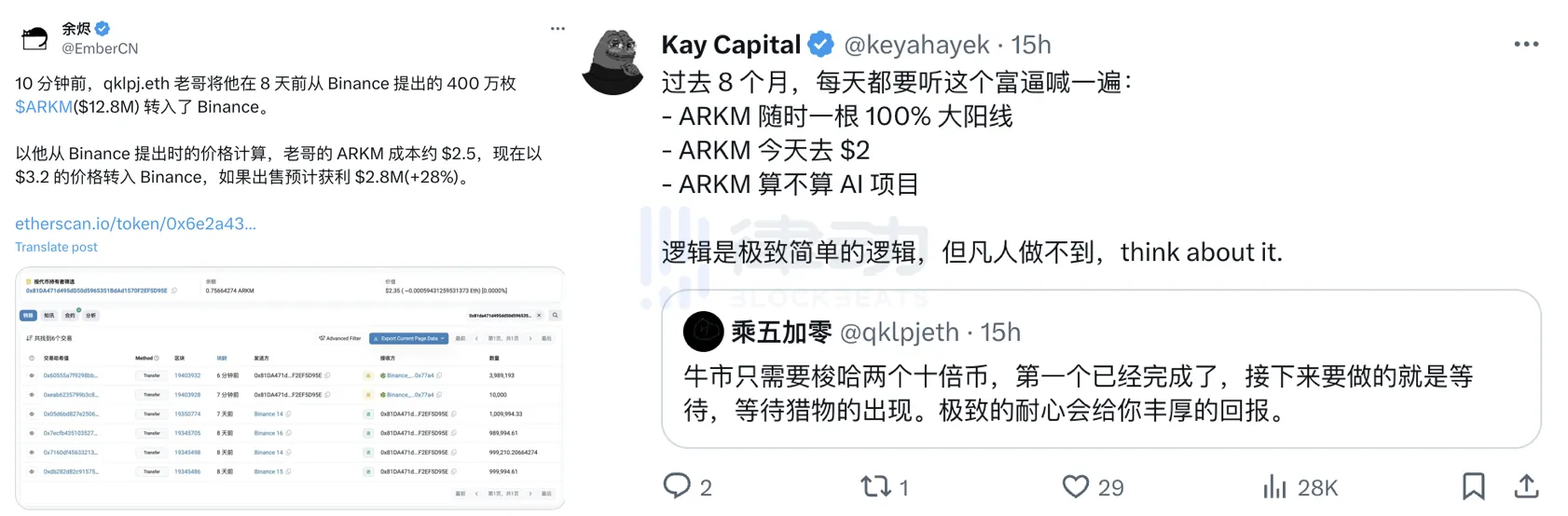 从社区讨论中可知,qklpj.eth 在过去八个月的时间里一直持有 ARKM,此前曾在 2023 年 11 月$ 0.386 的价格将 1009 万 ARKM($ 3.16 M) 全部转入 Binance。而上周末 ARKM 最高达到 3.9 美元。