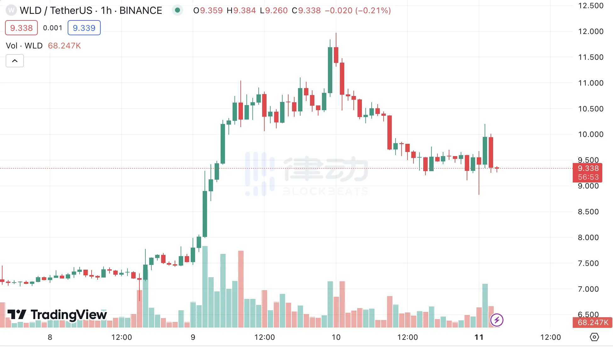 Worldcoin(WLD)回落跌破 10 美元, 24 小时跌超 20% ,现报价 9.3 美元;