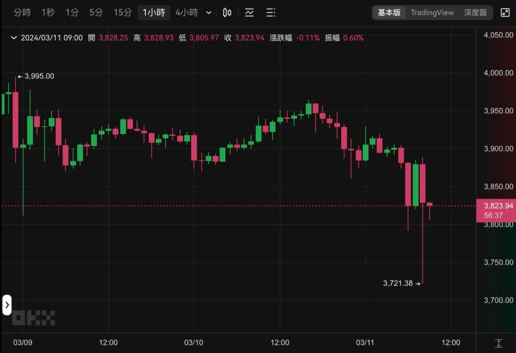 至于以太坊(ETH)跌幅则更为剧烈,昨日傍晚最高触及 3,964 美元之后,同样震盪走低,稍早一度跌至 3,721 美元,截稿前现报 3,823 美元,近 24 小时下跌 1.64%。