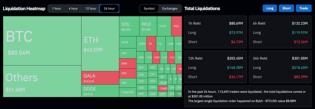 BTC 未能突破 7 万反转向下的行情,据 Coinglass 数据 显示,过去 24 小时,加密货币全网爆仓金额超过 3 亿美元,有超 11.3 万人遭清算,可见埋伏突破单的投资者仍有不少。