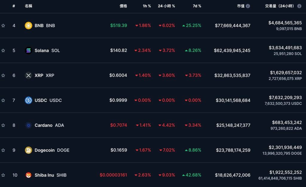 CoinMarkeCap 数据 显示 ,前十大币种近 24 小时齐走低,跌幅最大的是狗狗币 DOGE 和柴犬币 SHIB,分别下挫超 7% 和 8%,其他代币也有约 3~6% 左右的跌幅。