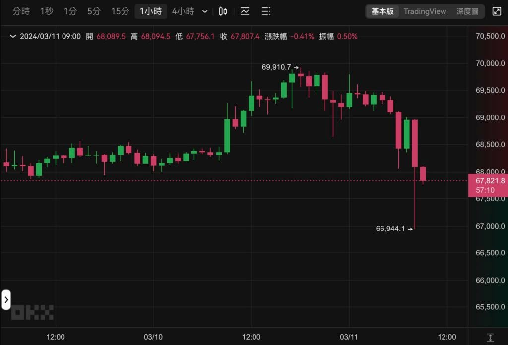 比 特币在上周五(8 日)深夜一度突破 7 万美元,再创历史新高后,周末两天的时间持续挑𢧐再破前高,昨(10)日傍晚一度来到 69,910 美元,不过未能持续走高。
