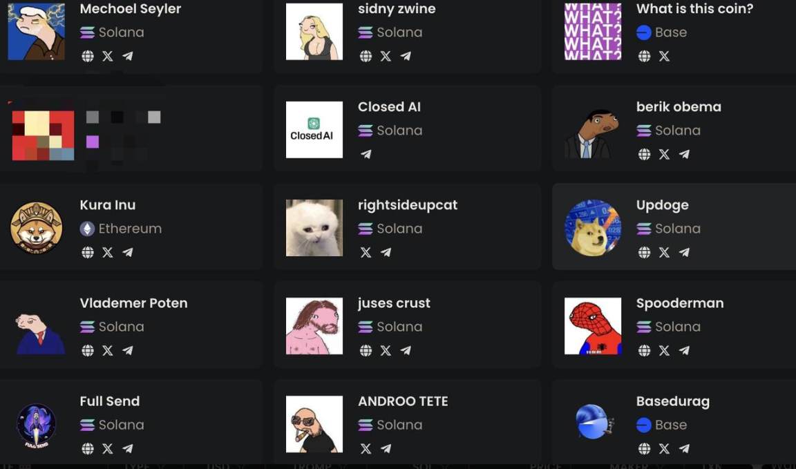 同样风格的 memecoin 几乎每天都在 Solana 上涌现,层出不穷,动辄百倍千倍。譬如 olen mosk(马斯克)、doland tremp(特朗普)、jeo boden(拜登)、Killary Clenton(希拉里)、JFK(肯尼迪)、berik obema(奥巴马)、whoren(Elizabeth Warren)、Puten(普京)、keem(金正恩)、gery gaysler(美 SEC 主席 Gary Gensler)、LEREY(贝莱德创始人 Larry Find)、Benance(币安)、Chungpingzao(赵长鹏)、taylur 与 TelorSwif(Taylor Swift)、YEEZUS(Adidas Yeezy 鞋)、Kenye East(Kanye West)、sidny zwine(美国女演员 Sydney Sweeney)、juses crust(耶稣)等等。笔者留意到,此类主题风格的 meme 已从 Solana 扩展至以太坊上。
