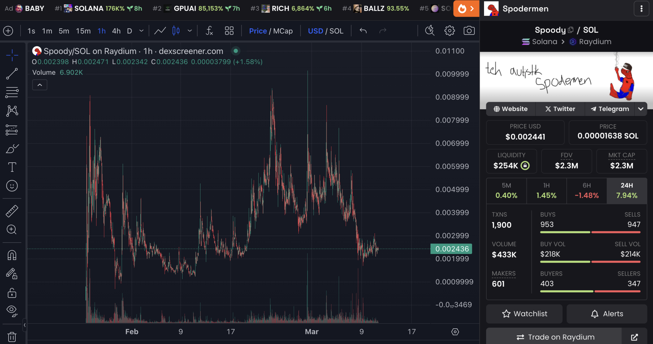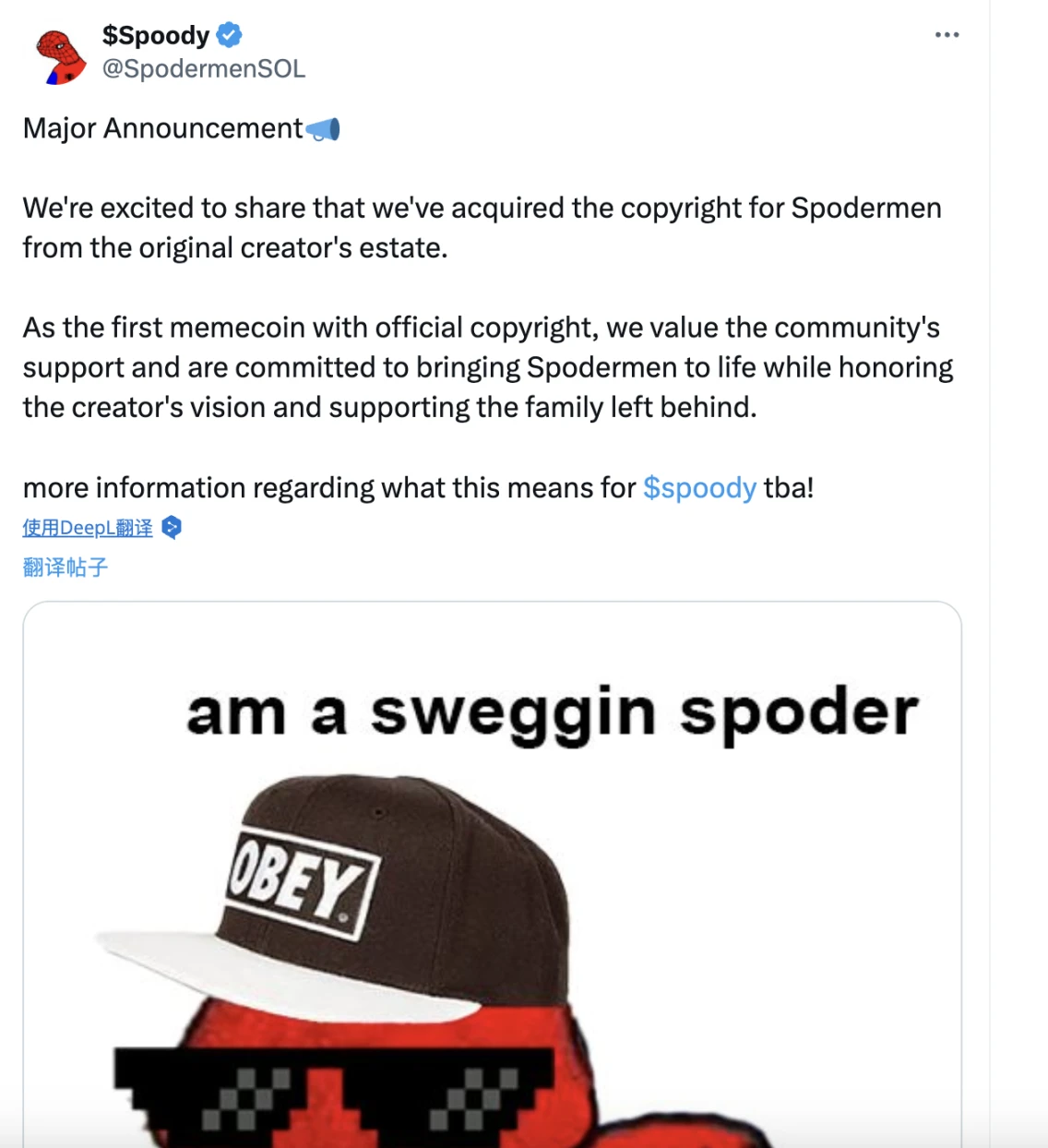 2024 年 1 月 24 日,Solana 上的 Spodermen 主题 meme 币 Spoody 正式上线,最高涨幅近 100 倍,目前市值 230 万美元。值得关注的是, 3 月 5 日,Spoody 宣布已从原创作者的遗产处获得 Spodermen 的版权。