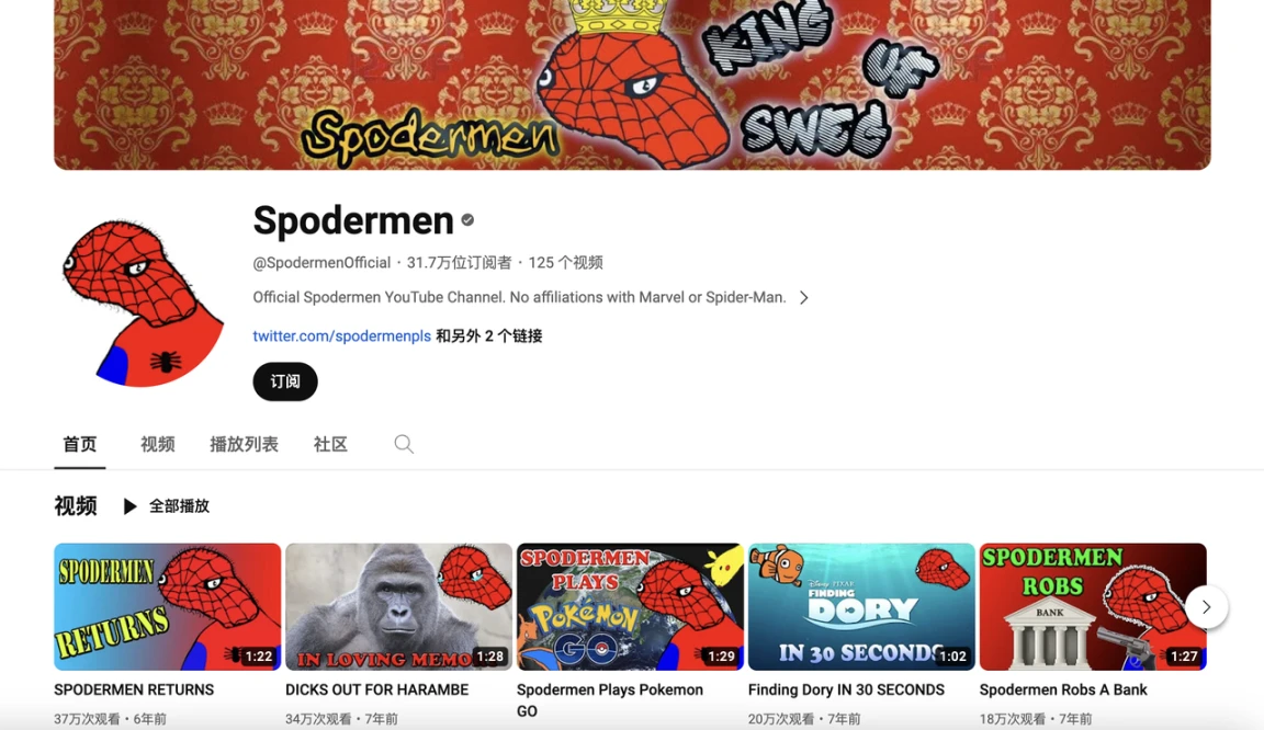 上线,现已有 31.7 万名订阅者,最后一个视频是 2018 年,第一个视频「Spoderman Theme Song」在 5 年内获得超 68 万次观看。