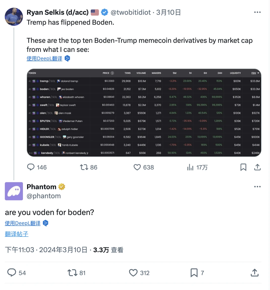 事实上,tremp 与 boden 都是这一段时间的政治符号,是美国政治模因化的结果。譬如,昨日 Messari 创始人兼 CEO Ryan Selkis 发推称 tremp 的市值已经超过了 boden,但随后加密钱包 Phantom 在评论区提问 Ryan 是否投票支持了 boden。