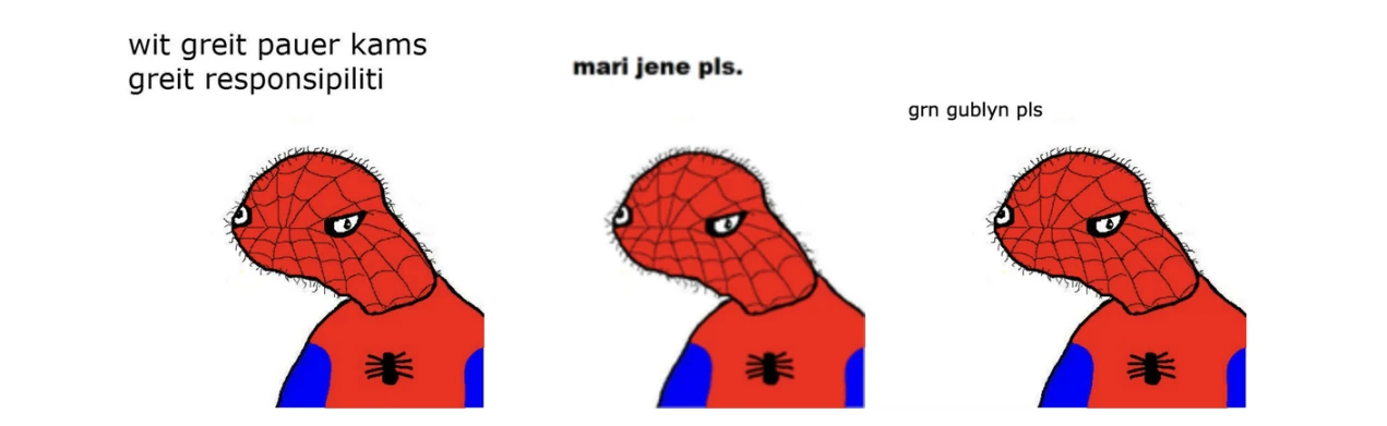 起初,大家转载 Spoderman 图片并进行评论,这些评论就包括故意拼错 Spider-Man 字母,Mary Jane 和 Green Goblin 也改写成 mari jene 和 grn gublyn。