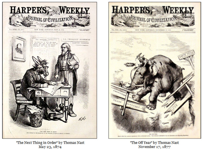 Pepe 等模因与美国总统竞选的故事就是这样诞生的。但 meme 本身是漫画的表现形式,美国的政治漫画早在 19 世纪下半叶就已出现,当时美国漫画之父 Thomas Nast 的漫画对 5 次总统选举产生了重要影响,包括支持林肯、格兰特、海斯与克利夫兰,并用尖刻的漫画嘲讽竞选失败者。美国两党政治中的「驴象之争」,也正是 Thomas Nast 于 1874 年、 1877 年发表在《哈珀周刊》上的漫画创作。