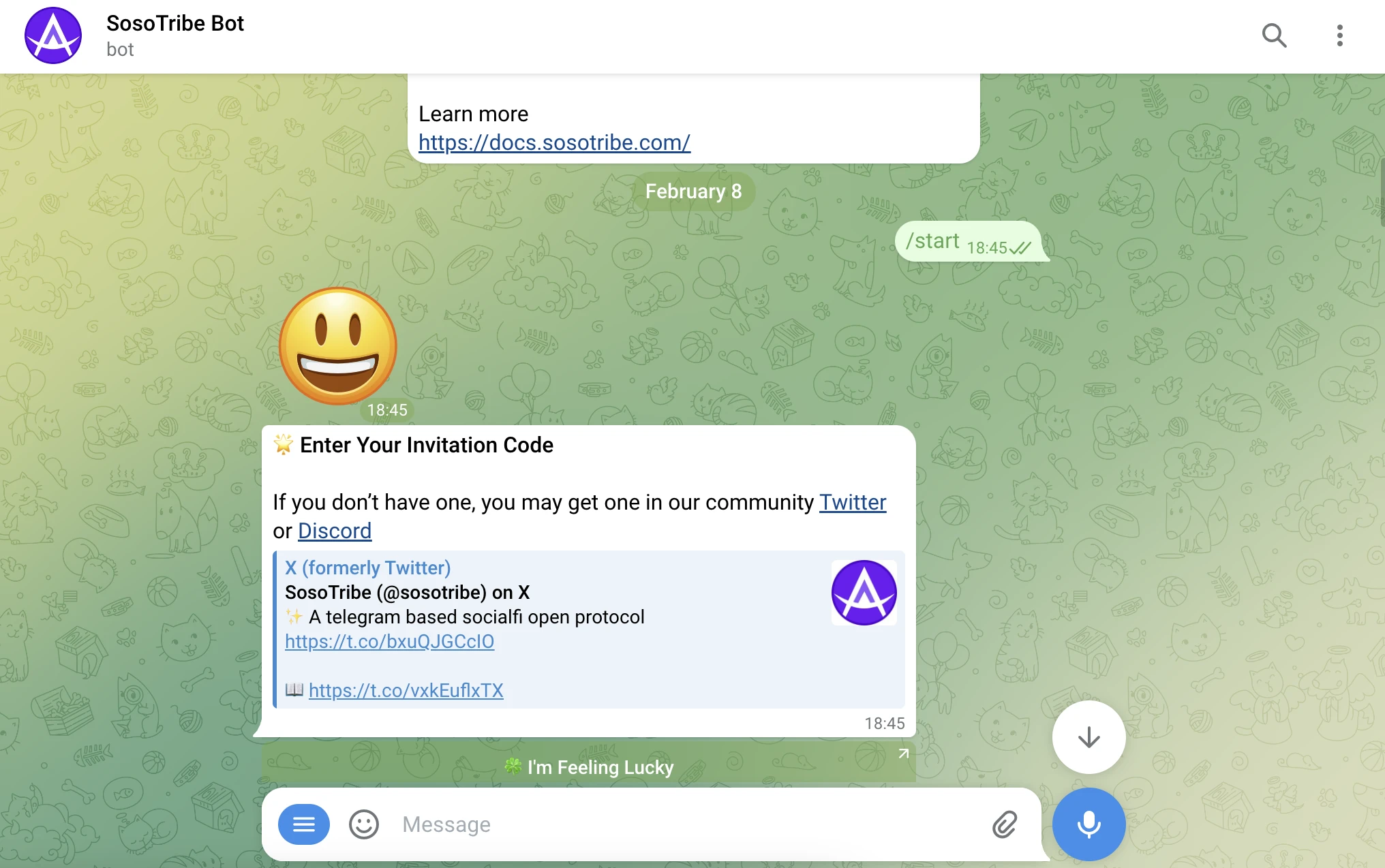STEP 1. 打开链接: https://t.me/sosotribe_bot ,之后输入“ /start”