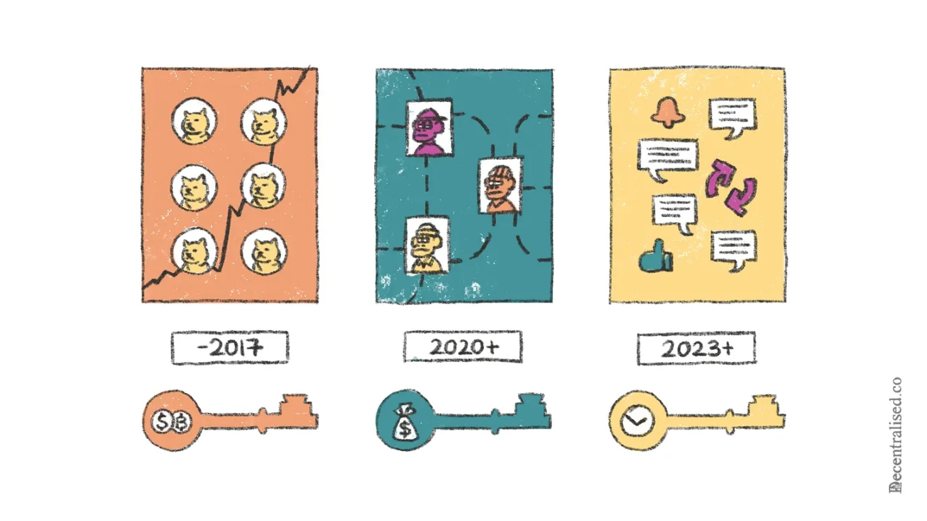 2017 年的 ICO 热潮期间,我们见证了链上社区的爆发。人们通过 Web3 项目发送 ETH 来换取新发行的代币。金融原语(如代币)是构建社区的强大工具,因为它们为人们提供了共同的目的、目标和兴趣。但一年后,当这些代币的价格下跌时,社区就动摇了。现在,我们看到这种趋势在 meme 中重新抬头。