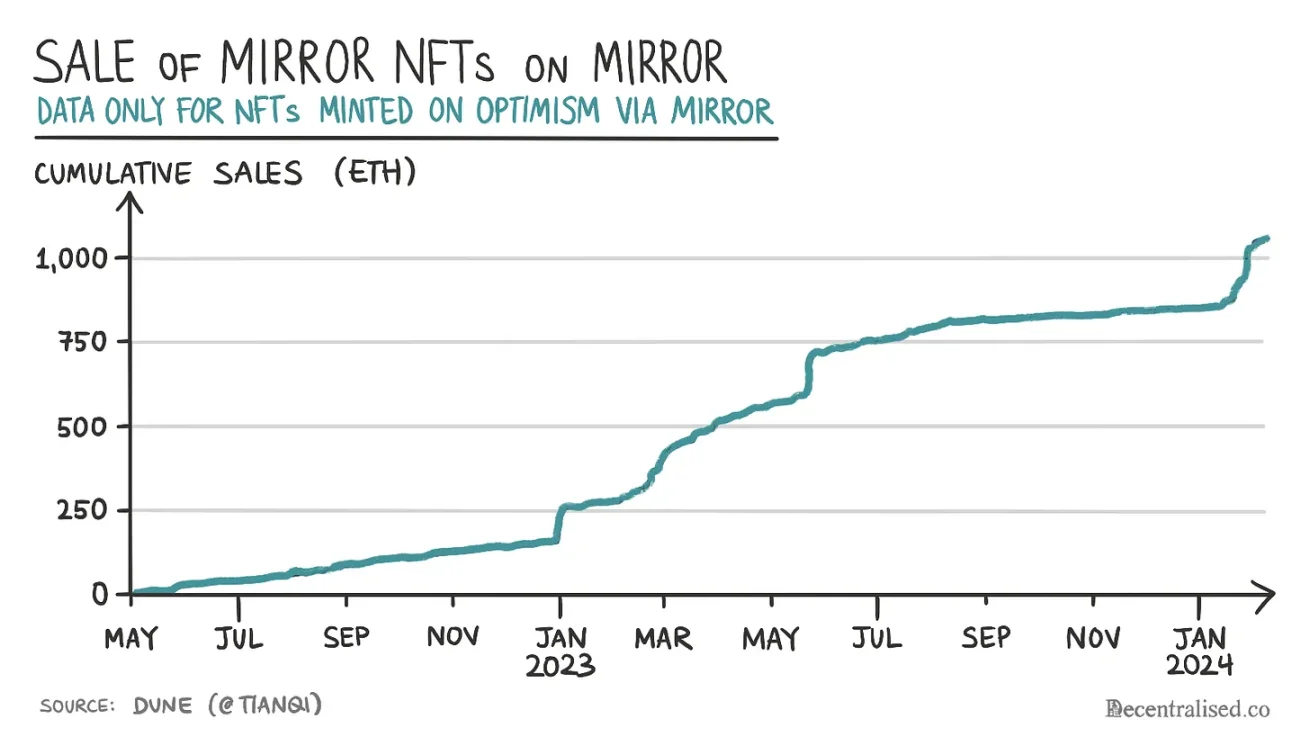 这似乎有些牵强,但我确实观察到了这种迹象。在上一个周期(2021 年)中,受众使用 NFT 来表明自己是核心信徒。例如,你可以在 Mirror 上铸造你最喜欢的作者的 NFT。