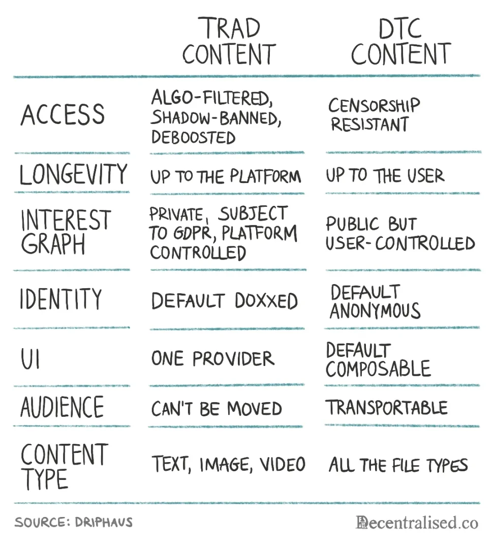 以前,你必须向 Meta 或 Google 等平台支付费用,因为它们汇总了你可以与受众群体互动的渠道。在我看来,随着 Farcaster 等协议的成熟,这种关系即将被打破,因为历史上中心化数据库中的数据现在将公开。