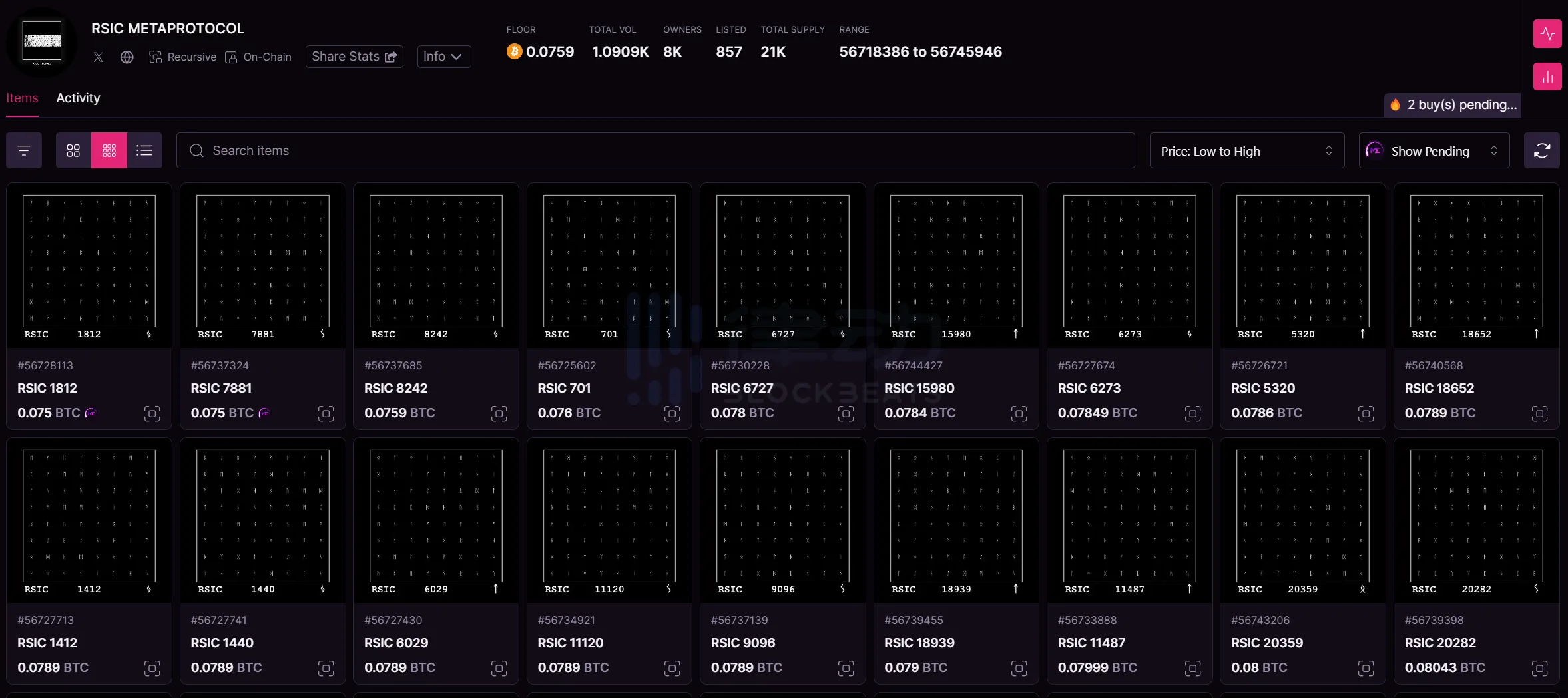 RSIC 开盘的价格就基本突破了 0.01 比特币, 2 天后快速上涨到了 0.05 比特币,然后回落到 0.03 比特币并保持稳定。进入 2 月,RSIC 基本是一路上涨,最高峰时突破了 0.1 比特币,直至几乎与前高持平后逐渐回落。现在的地板价在 0.076 比特币左右。