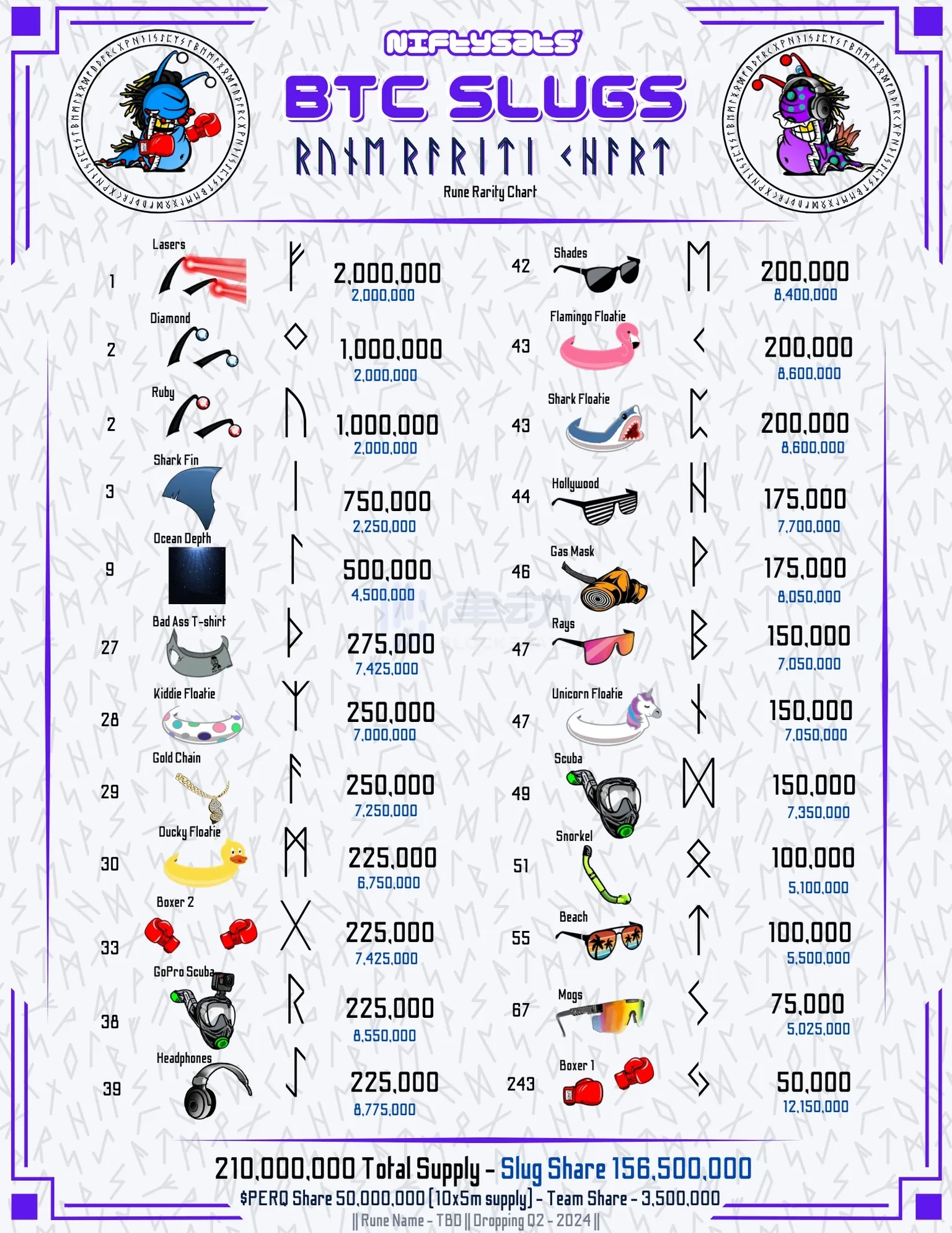 这个项目的「符文」Token 规则切成两块。首先是和这些鼻涕虫的特征有关,有以下特征的鼻涕虫在未来能够获得数量不同的「符文」Token。当然,特征奖励不叠加,如果一只鼻涕虫有多个奖励特征,只取最高的那个,多出来的会平均分给没有奖励特征的可怜虫们。