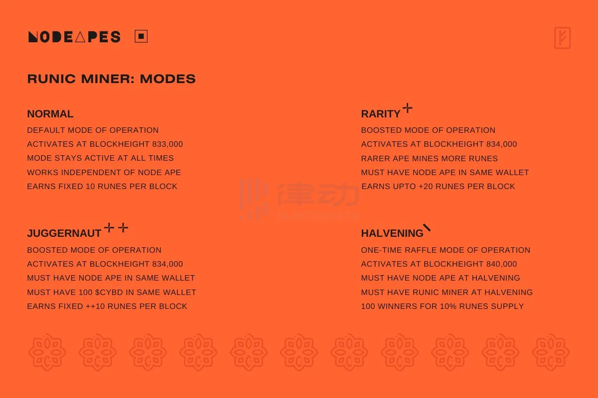 因为是个 Node Apes 这个项目绑定的,Runic Miner 的规则思路基本上就是让人「拿好全家桶」——Node Apes + $CYBD + Runic Miner 一起拿着加成是最多的。具体的规则可以看下图: