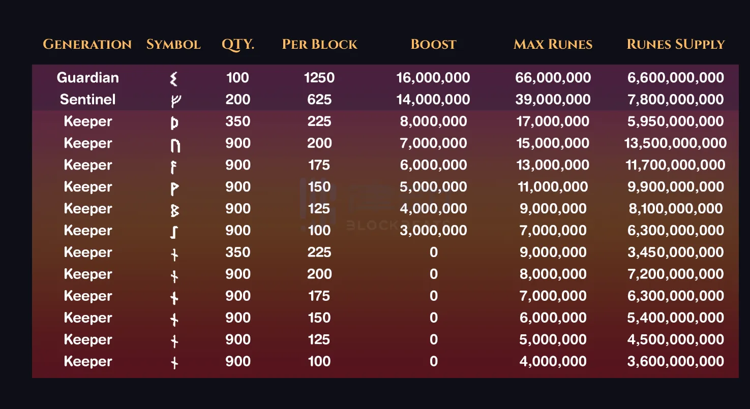 10000 个 The Rune Guardians 将在未来瓜分总量为 1000 亿个的「符文」Token。不同的属性对挖矿有不同的加成,可以通过 Magic Eden 筛选属性,并参照下图的属性增益表: