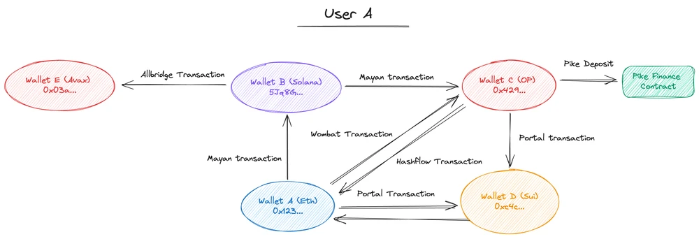 为了最大限度地增加每个用户获得空投资格的机会,Wormhole 构建了一个所有权图,为属于该用户的一组钱包分配一个唯一的用户 ID,包括与任何一个虫洞生态系统应用程序(如 Pike、Mayan、Allbridge、Portal 和许多其他 DApp)交互的钱包。