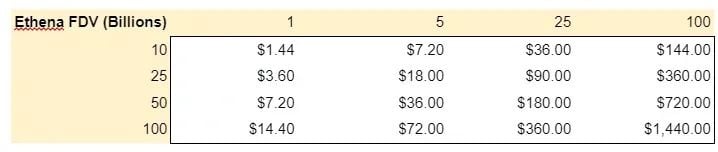 以这些倍数为指导,我建立了以下潜在的 Ethena FDV。