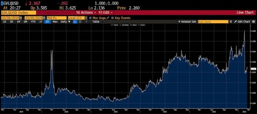 美国政府证券流动性指数图表清楚地显示自 COVID 以来美国国债市场流动性的下降(数位越大,流动性状况越差)。只需少量抛售就能扰乱市场。我所说的扰乱市场是指债券价格迅速下跌或收益率上升。