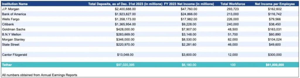 如果这些银行的执行长们没有通过谈判获得 Tether 的股权,以换取银行服务,那他们就是傻瓜。当我稍后介绍 Tether 的员工人均收入指标时,你就会明白其中的原因。