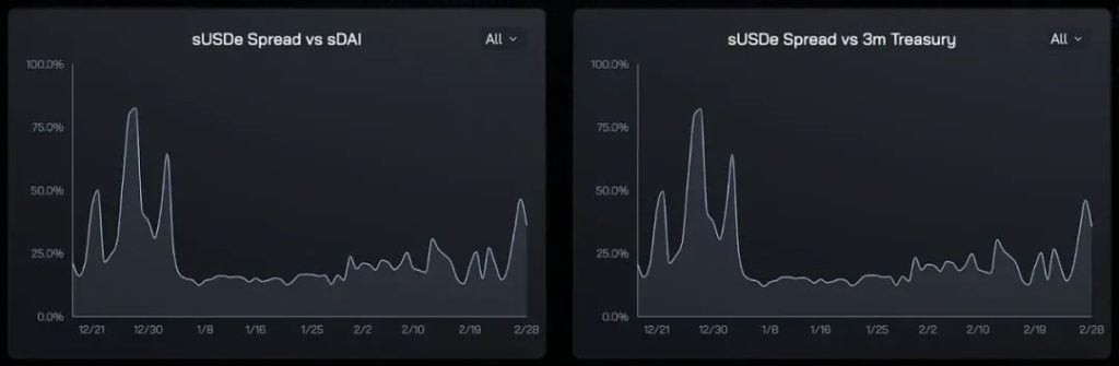 Guy 之所以选择 ETH,是因为以太坊网路提供了原生收益。为了提供安全性和处理交易,以太坊网路验证者直接通过协议为每个区块支付少量的 ETH。这就是我所说的 ETH 质押收益率。此外,由于 ETH 现在是一种通缩货币,因此 ETH / 美元远期、期货和永续掉期交易与现货相比持续溢价是有根本原因的。空头永续掉期持有者可以捕捉这种溢价。将 ETH 实物质押与 ETH/USD 永续掉期空顶级位结合起来,就能创造出一种高收益的合成美元。截至本周,现货 ETH 美元(sUSDe)的年收益率约 > 50%。