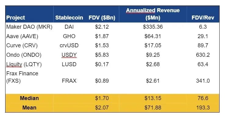 该模型的关键部分是应采用完全摊薄估值(FDV)与收入的比率。这始终是一个猜测游戏,但我将根据可比的 DeFi 稳定币专案提出一些未来的路径。