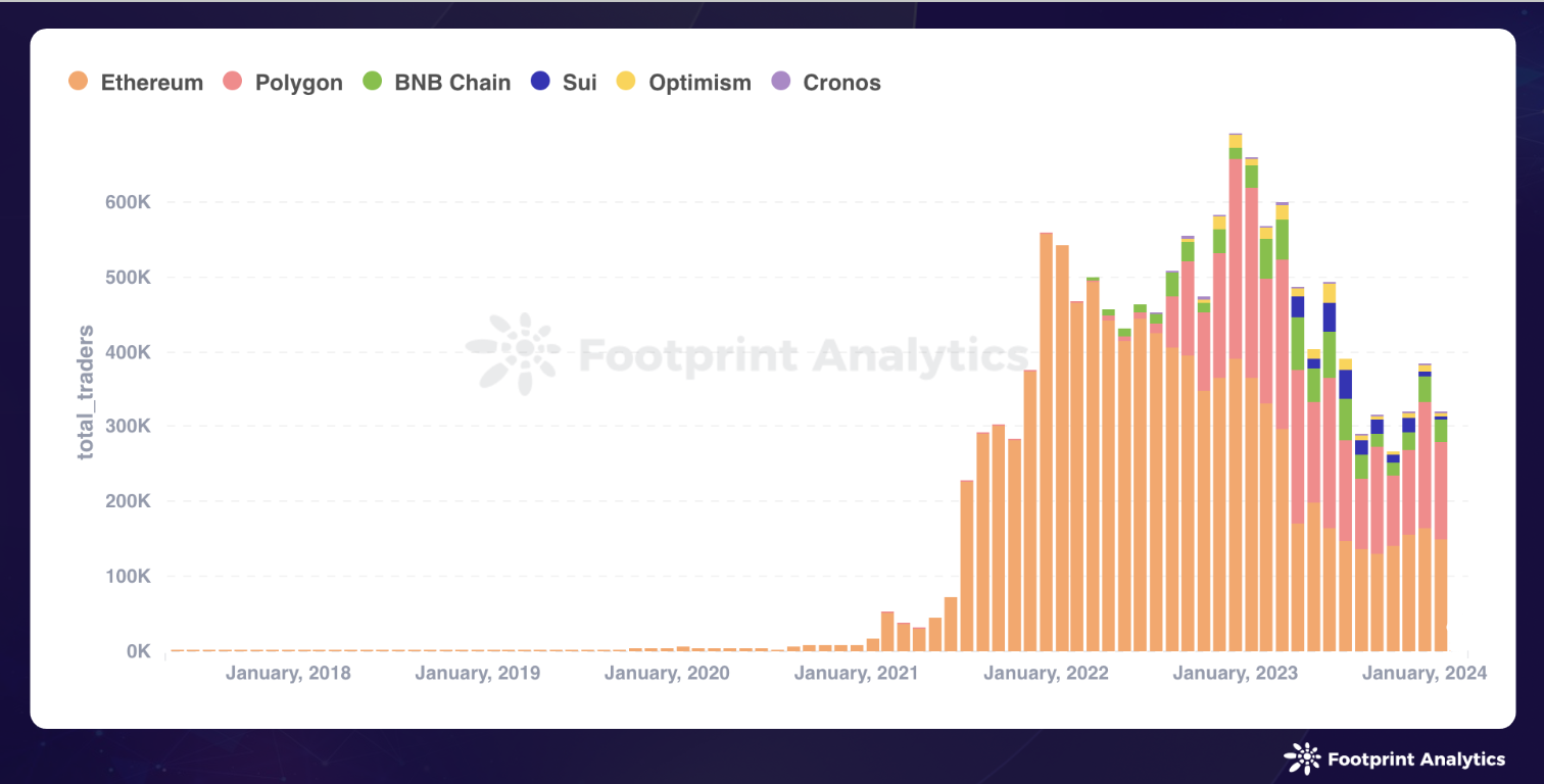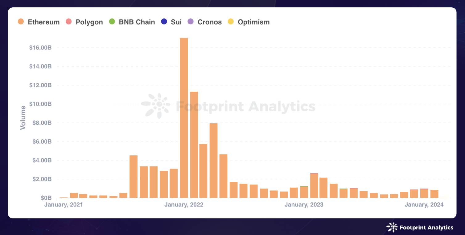分析以太坊、Polygon、BNB 链、Cronos、Optimism 和 Sui 等公链的数据,我们发现交易量降至 8.4 亿美元,较 1 月份下降了 16.1%。同时,交易量下滑了 25.8%,独立用户(钱包)数量也减少了 14.6%。这种下降趋势部分归因于2月份天数较少。此外,关键 NFT 系列出现明显波动,市场动态的变化和投资者情绪的转变,也是造成下滑趋势的原因。