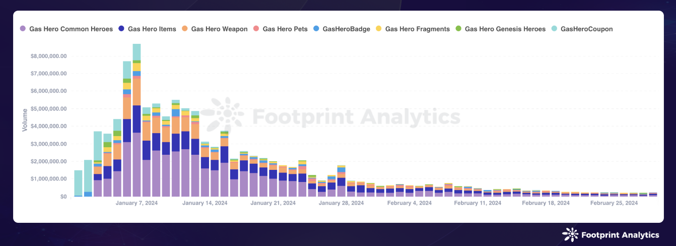 根据 Footprint Analytics 的数据,2 月,Find Satoshi Lab 开发的 Web3 游戏 Gas Hero 的 NFT 交易量大幅下跌 87.2%,降至 1,230 万美元,这与其 1 月份上线当月 9,610 万美元交易量形成鲜明对比。此下降对 Polygon 和 Mooar 平台的交易活动产生了显著影响,交易量明显减少。Gas Hero 团队于 2 月 28 日宣布战略调整,重回封闭测试阶段,以优化经济模型并提升用户体验。